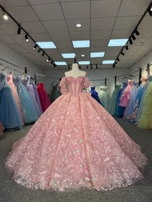• Sparkly Pink Beaded Off Shoulder Ball Gown Quinceanera Dress Lace Up Big Bow Sweet 15 Gowns