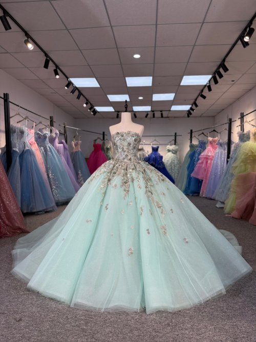 • Sparkly Mint Green Strapless Quinceanera Dress Beaded Lace Applique Ball Gown Sweet 15 Gowns