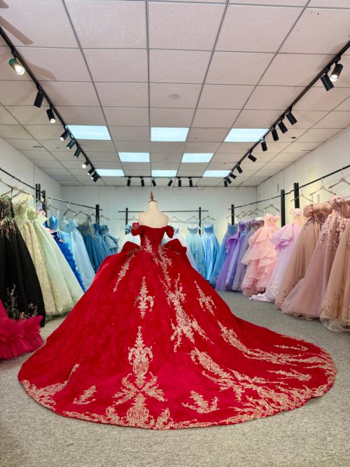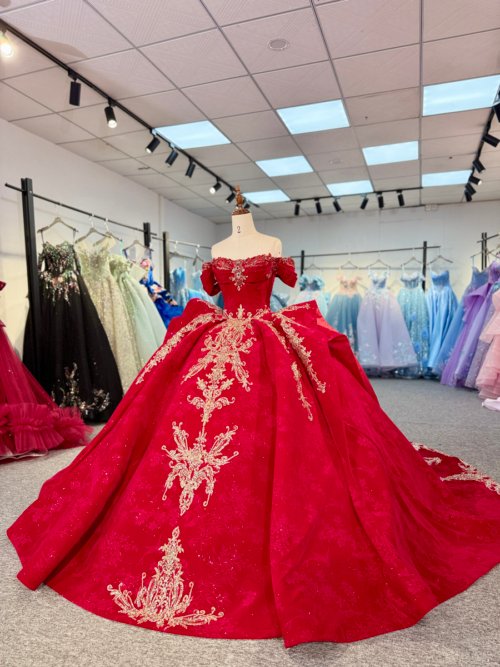 • Luxury Red Quinceanera Dress Off Shoulder Gold Appliques Ball Gown Cathedral Train
