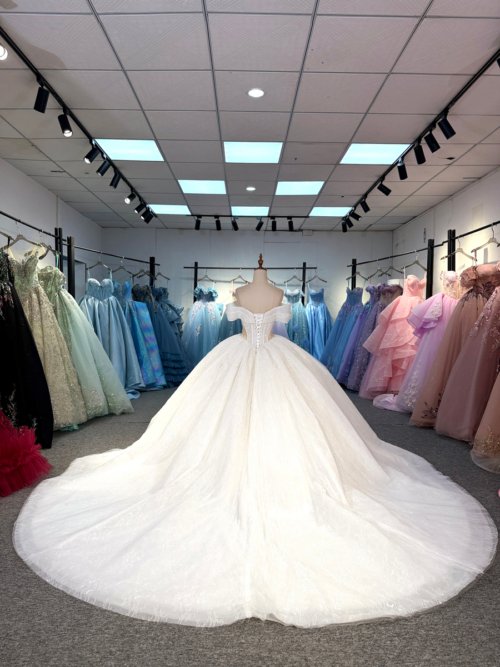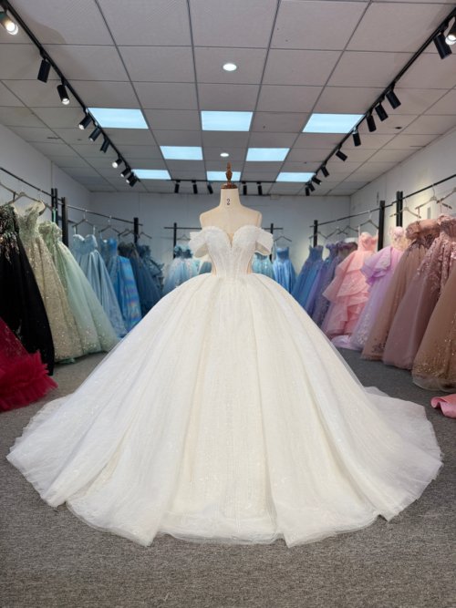 • Sparkling Ivory Quinceanera Dress Off Shoulder Glitter Ball Gown Long Train