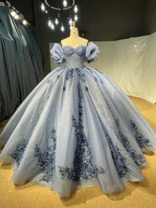 • Elegant Sparkly Light Blue Ball Gown Prom Dress Off Shoulder Floral Lace Up Sweetheart Quinceanera Gown