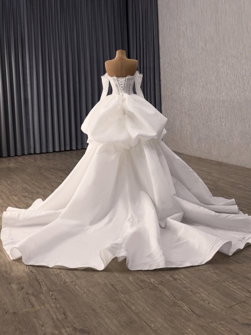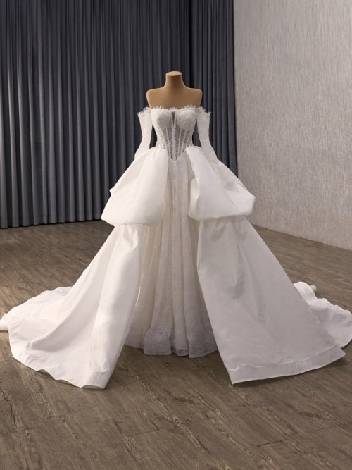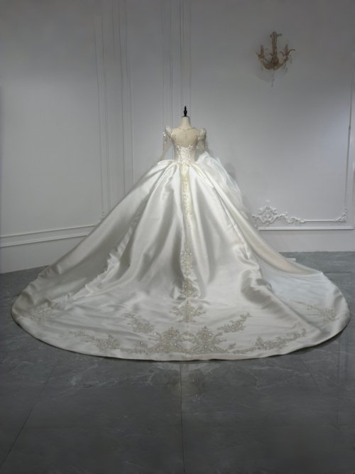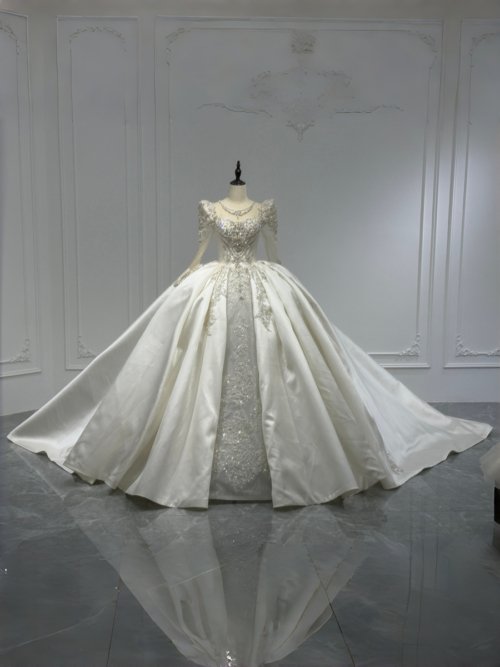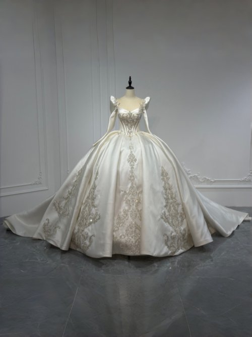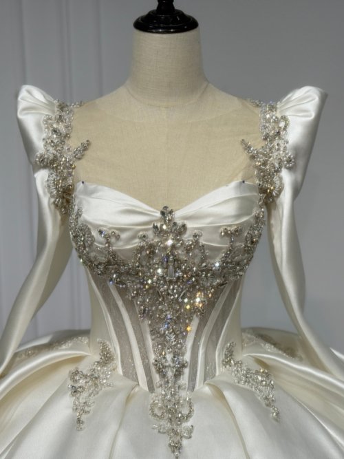 • Elegant Ivory Satin Crystal Lace Ball Gown Wedding Dress Long Sleeve Off Shoulder Bridal Gown Corset Train