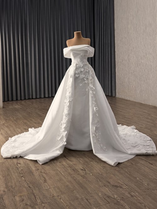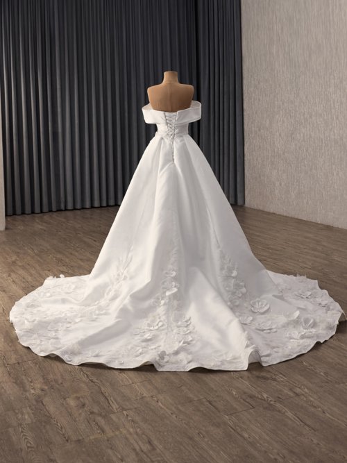 • Chic Ivory Floral Applique Off Shoulder Wedding Dress Corset Back Ball Gown Chapel Train Gown