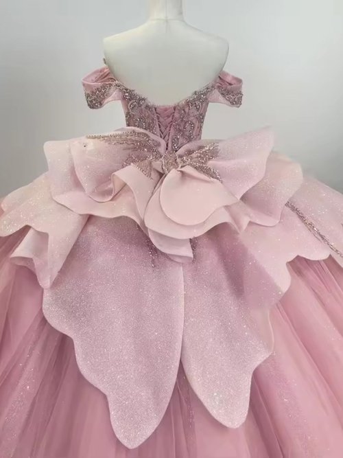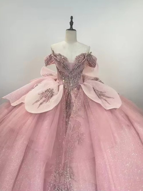 • Shimmering Pink Sequin Crystal Off Shoulder Quinceanera Dress Sweetheart Big Bow Ball Gown Corset Gown