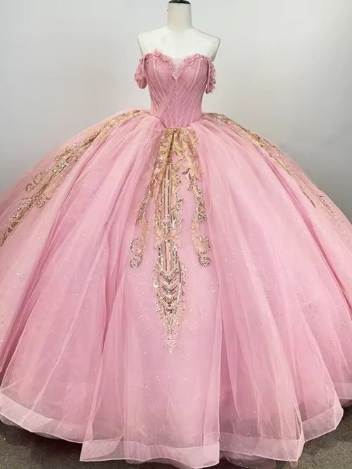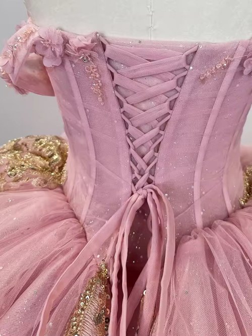 • Sparkling Pink Gold Embroidered Off Shoulder Quinceanera Dress Sweetheart Corset Ball Gown Princess Gown