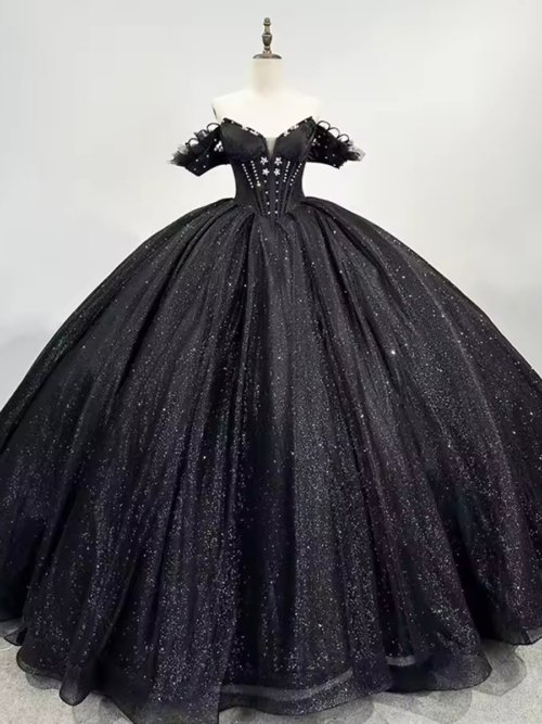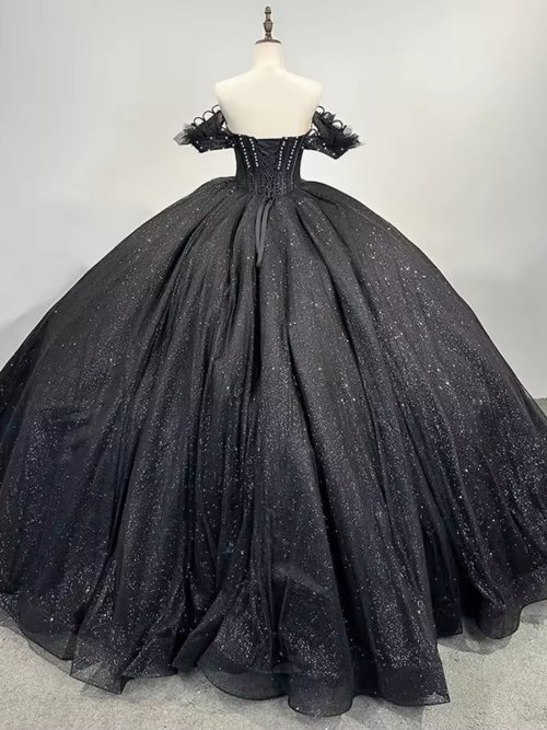 • Sparkling Black Crystal Star Sweetheart Quinceanera Dress Off Shoulder Ball Gown Corset Princess Gown