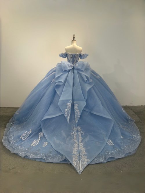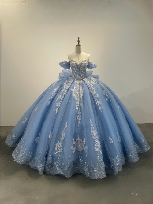 • Sparkling Sky Blue Silver Lace Quinceanera Dress Off Shoulder Bow Ball Gown Sweetheart Corset Gown
