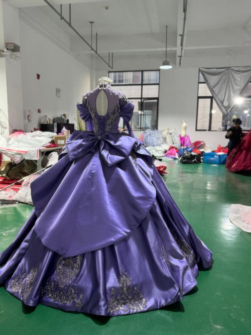 • Royal Purple Sequin Beaded High Neck Quinceanera Dress Long Sleeve Ball Gown Keyhole Back Gown