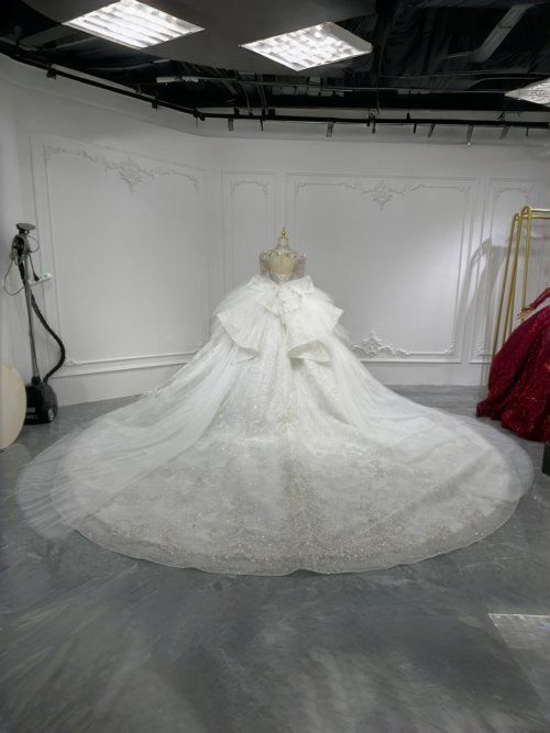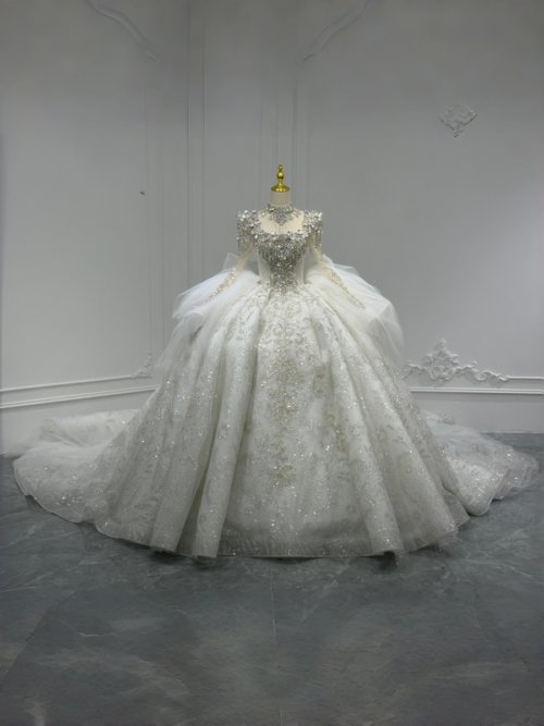 • Sparkling Ivory Crystal High Neck Wedding Dress Long Sleeves Bow Back Ball Gown Cathedral Train Gown