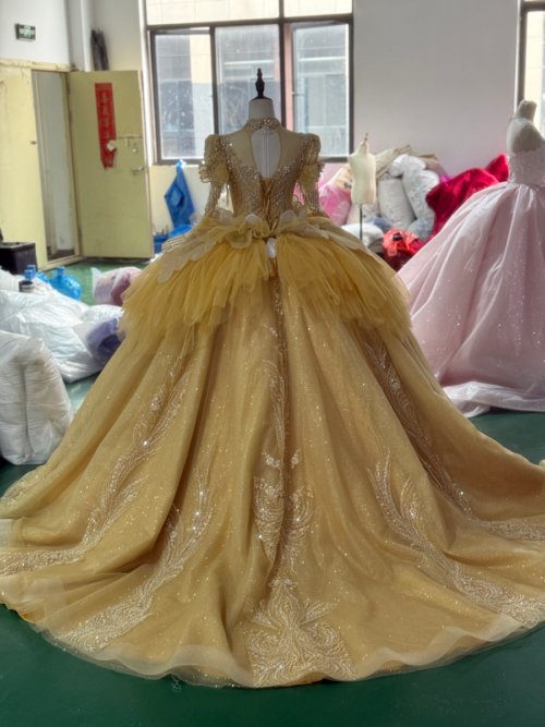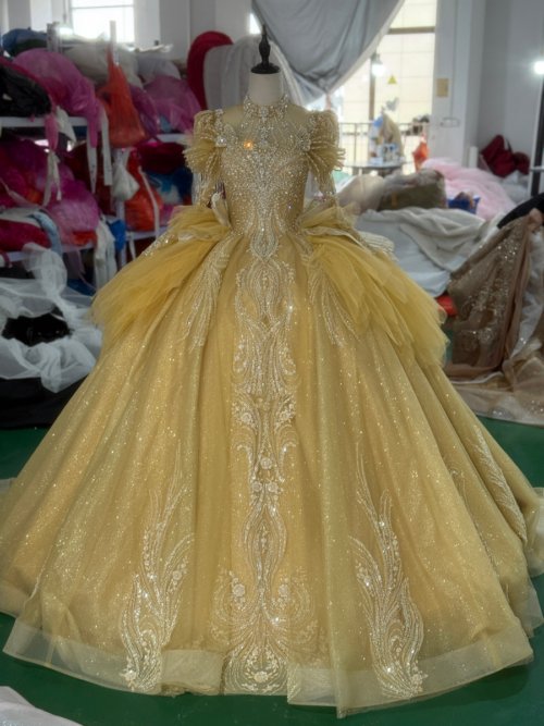 • Sparkling Gold Beaded Ruffle High Neck Quinceanera Dress Long Sleeve Ball Gown Corset Princess Gown